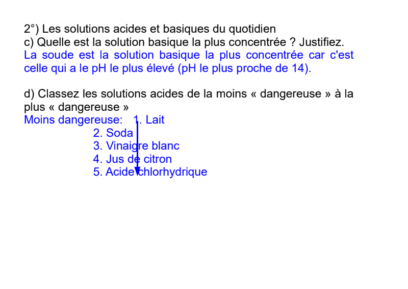 Voici la correction des questions de la fiche "acides, bases, attention danger!" auxquelles vous deviez répondre pour cette semaine.