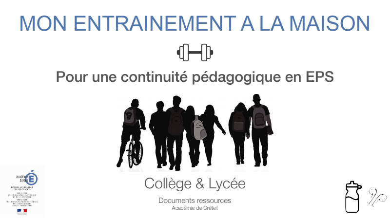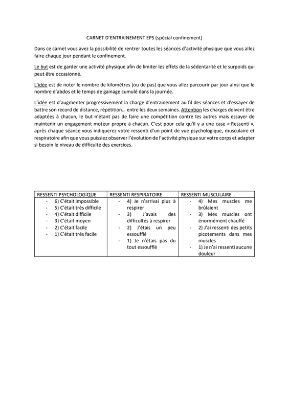 Bonjour à tous, en ce temps de confinement il est important de garder une activité physique quotidienne pour limiter les effets de la sédentarité. L'OMS recommande au moins 30' d'activité physique par jour en alternant un jour sur deux, un travail de renforcement musculaire et un travail d'endurance. Ci-joint un document qui va vous aider à conserver cette activité physique chez vous. Je vous rappelle la nécessité de respecter les règles de sécurités :s'échauffer avant de commencer, avoir un espace suffisant pour ne pas se cogner et respecter les distances barrières (pas à moins d'1m) si vous sortez pour faire votre activité d'endurance. Je vous joins aussi un carnet d'entraînement pour que je puisse avoir un suivi de votre activité et que vous puissiez voir vos progrès (il y a un challenge où vous devrez faire mieux la deuxième semaine de travail que la première). Si jamais vous ne savez pas quel niveau choisir au début ou si vous avez des problèmes de dos, d'asthme,... n'hésitez pas à me contacter pour que je vous conseille ou que je vous adapte le travail. Remplissez bien la partie ressenti elle vous permettra de voir l'adaptation de votre corps à l'effort, et me permettra de vous adapter le travail si jamais c'est trop facile ou trop difficile. Bon courage à vous. Cordialement l'équipe EPS.